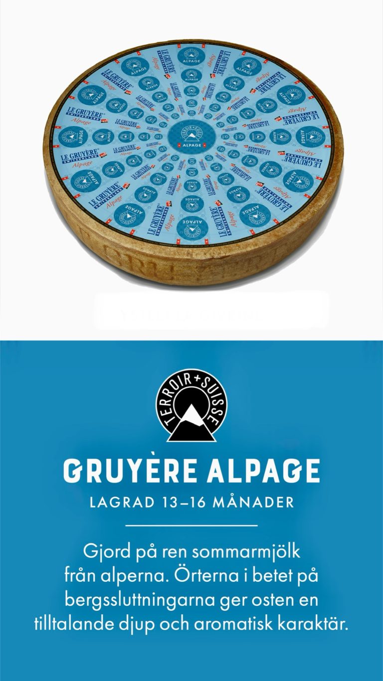 Under september är det premiär för vår Gruyère D’Alpage AOP. Den här sommarvarianten på Gruyère från certifierad alp är gjord på den absolut finaste mjölken, ju högre upp i bergen desto fler örter i betet, ju mer varierat bete desto bättre mjölk=finare ost med fler omega3 fetter samt smaker. Inga tillsatser eller kraftfoder, bara kor som är tillfreds och som kan bli över 20 år gamla. Vi har valt ut en ny producent, Fabien Kolly (fd världsmästare) som ystar uppe på Alp Montasson