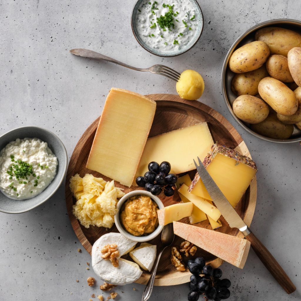 Använd dig av en finare potatis som tex amandine, delikatesspotatis eller mandelpotatis. Dra ihop en enklare gräddfilssås med klippt gräslök och en nypa salt. Servera med 2-4 hårdostar, gärna Gruyère, och några mjuka ostar som tex Époisse, små getostar, rinnande Brieostar, blåmögel etc. Som en midsommartallrik minus sill plus ost. Allt funkar!