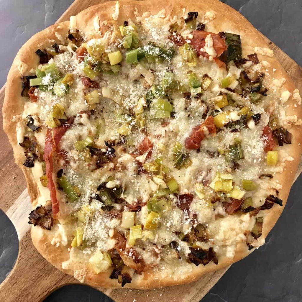 Pizza med riven Gruyère, crème fraîche, pancetta , citron & chili